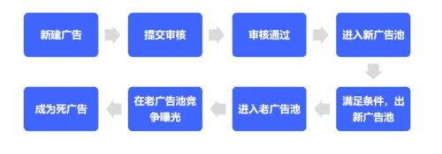 新建广告→提交审核→审核通过→进入新广告池→满足条件,出新广告池→进入老广告池→在老广告池竞争曝光→成为死广告