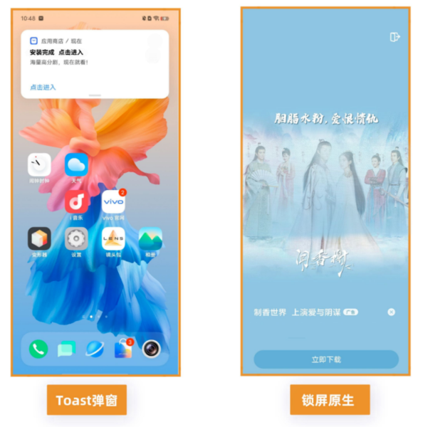 配合视频端内高质量自制热播剧上线节点,vivo商店整合动态icon、Toast弹窗、顶部Banner等强曝光资源;非商店加持锁屏原生资源,个性化定制专题活动,快速触达潜在客户提升下载率与激活率。