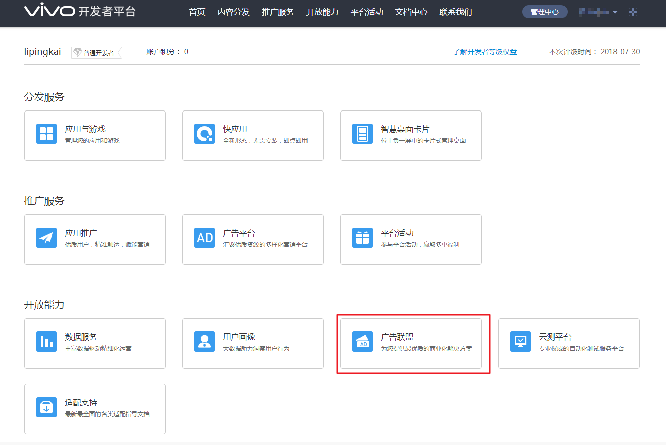 2. 登录vivo开发者平台,首页向下滑动至平台服务,点击“广告联盟”,或进入管理中心,在平台服务处点击“广告联盟”,进入广告联盟主界面。如下图: