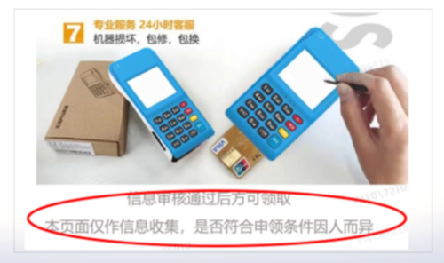 5.POS机广告:如不是无门]槛领取商品,则需说明“申请审核通过后才可领取”。建议在落地页处添加提示语“本页面仅做信息收集,是否符合申领条件因人而异”。