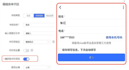 1.表单组件的手机号码字段中新增"一键获取本机号码”设置条件,开关默认关闭状态。开关开启后,用户在表单模块可以点击“一键获取本机号码”按钮,无需手动填写手机号码,提升表单填写效率与用户交互体验。