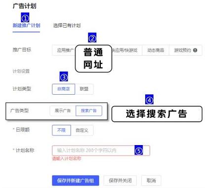 推荐目标选择普通网址,计划类型选择非商店,广告类型选择搜索广告