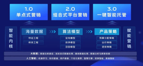在vivo1.0单点式营销阶段,营销的目的是通过营销环节升级,点对点提升营销效率;到了2.0阶段,智能化程度会加深,营销产品能力更加开放,面向vivo手机广告主提供更多投放组合模式;而在3.0阶段,智能托管模式将落地并应用于商业场景,打通全链,解放双手,通过算法学习找到投放的优质解决方案。